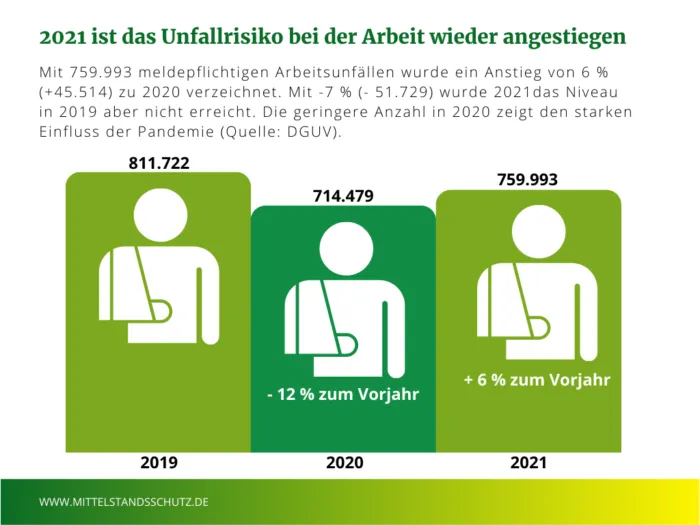 Schaut man sich die Statistik der Deutschen Gesetzlichen Unfallversicherung an, lässt sich erkennen, dass die Zahl der meldepflichtigen Unfälle im Jahr 2020 erst einmal von 811.722 auf 714.419 gesunken ist. Im Jahr 2021 kam es mit 759.993 wieder vermehrt zu meldepflichtigen Arbeitsunfällen. Die Statistik zählt 370 tödliche Arbeitsunfälle. Das sind 56 mehr als im Jahr davor. Dazu kamen 46.224 Unfälle im außerberuflichen Kontext, wozu ehrenamtliche Tätigkeiten wie die freiwillige Feuerwehr oder die häusliche Pflege zählen.