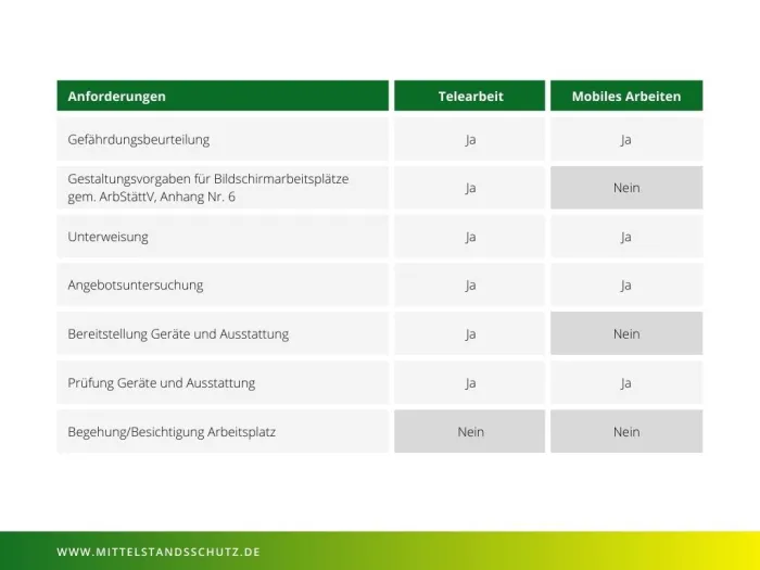 Eine wichtige Information gleich zu Beginn: Eine einfache „Umbenennung“ von Homeoffice in „mobiles Arbeiten“ führt nicht automatisch zu einer anderen Rechtslage. Die rechtlichen Anforderungen an das mobile Arbeiten und die Telearbeit unterscheiden sich in wesentlichen Punkten. Relevante Grundlagen bilden in diesem Zusammenhang außerdem das Arbeitsschutzgesetz (ArbSchG) und für Telearbeit die Arbeitsstättenverordnung (ArbStättV).