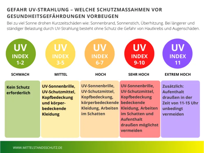 - bei hohem UV-Index (>6) auf Überstunden verzichten,
